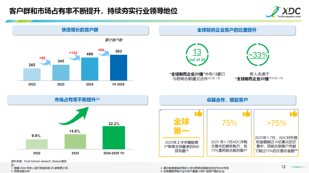 截至6月底,药明合联累计服务客户563家,较2024年末新增64家,其中2024年全球收入排名前20的制药公司中13家已与药明合联建立合作。这一客户基础的扩大和结构优化直接反映在交易数据中:2025年1-7月,全球ADC对外授权金额超10亿美元的交易中,药明合联客户贡献超75%总金额;同期ADC并购交易中,75%被收购企业为其现有客户。