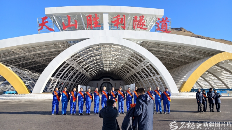 12月26日,乌尉高速公路建设者们在天山胜利隧道口合影留念。石榴云/新疆日报记者 汤永摄